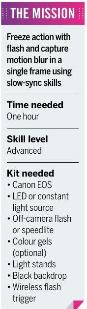 Whenever we use flash, we are effectively making two exposures in one. First there’s the flash exposure, where the subject is lit by the near-instant burst of light. But there’s also the ambient exposure, where the light in the scene – whether natural daylight, room lights or other artificial lighting – plays a part. Often the flash is so powerful that ambient light plays a negligible role in the overall exposure. But here, by stretching our shutter speed to several seconds, the divide is obvious. The ambient exposure creates the blur and the flash freezes the final movement of the subject. It might look like a Photoshop effect, but this is done entirely in-camera. There’s an element of trial and error in timing the motion of your subject and balancing the lighting, but when it all comes together, the results can be jaw-dropping.