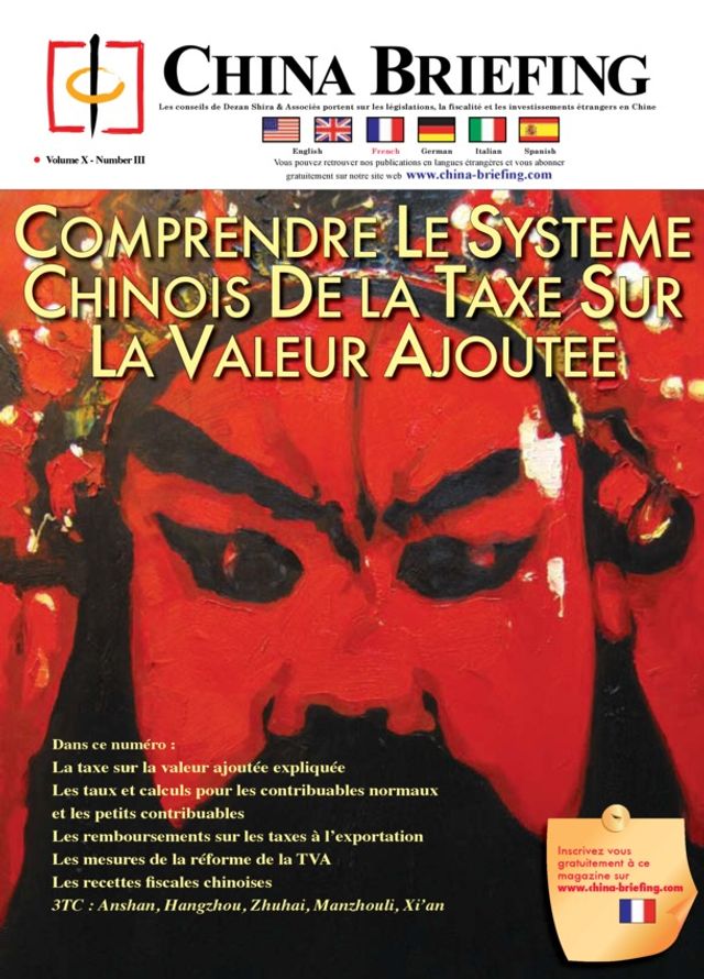 Dans ce numéro de China Briefing, nous examinerons attentivement le système chinois apparemment complexe de la taxe sur la valeur ajoutée. La TVA en Chine contribue pour une part importante aux recettes fiscales annuelles du pays et a un rôle essentiel au sein du système fiscal du gouvernement. Au début de 2009, les autorités centrales ont généralisé une réforme de la politique nationale sur la TVA qui avait auparavant été testée dans plusieurs régions du pays. La nouvelle réforme induit une modification du système chinois sur la TVA d'une perspective basée sur la production à une perspective basée sur la consommation. La réforme modifie également plusieurs des avantages fiscaux dont bénéficiaient les entreprises en Chine. Notre dossier de ce mois explique le système de la TVA en Chine, examine les taux et détaille les calculs pour les contribuables en général et ceux ayant un petit revenu. Il présente aussi les remboursements des taxes sur les exportations et aborde les mesures de la nouvelle réforme sur la TVA.