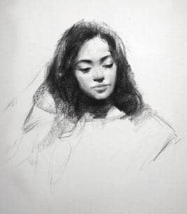 Many of my favorite works have been from those references I took during a model's break time, showing their natural postures and expressions. This drawing is from one such reference. Before I begin, I generate an ideal image of the subject in my head, which diverges in various ways from what is captured in the reference. I work on a thumbnail sketch to ensure that what I imagined will work in the actual drawing. During this process, I also choose the right material for the work based on the image.