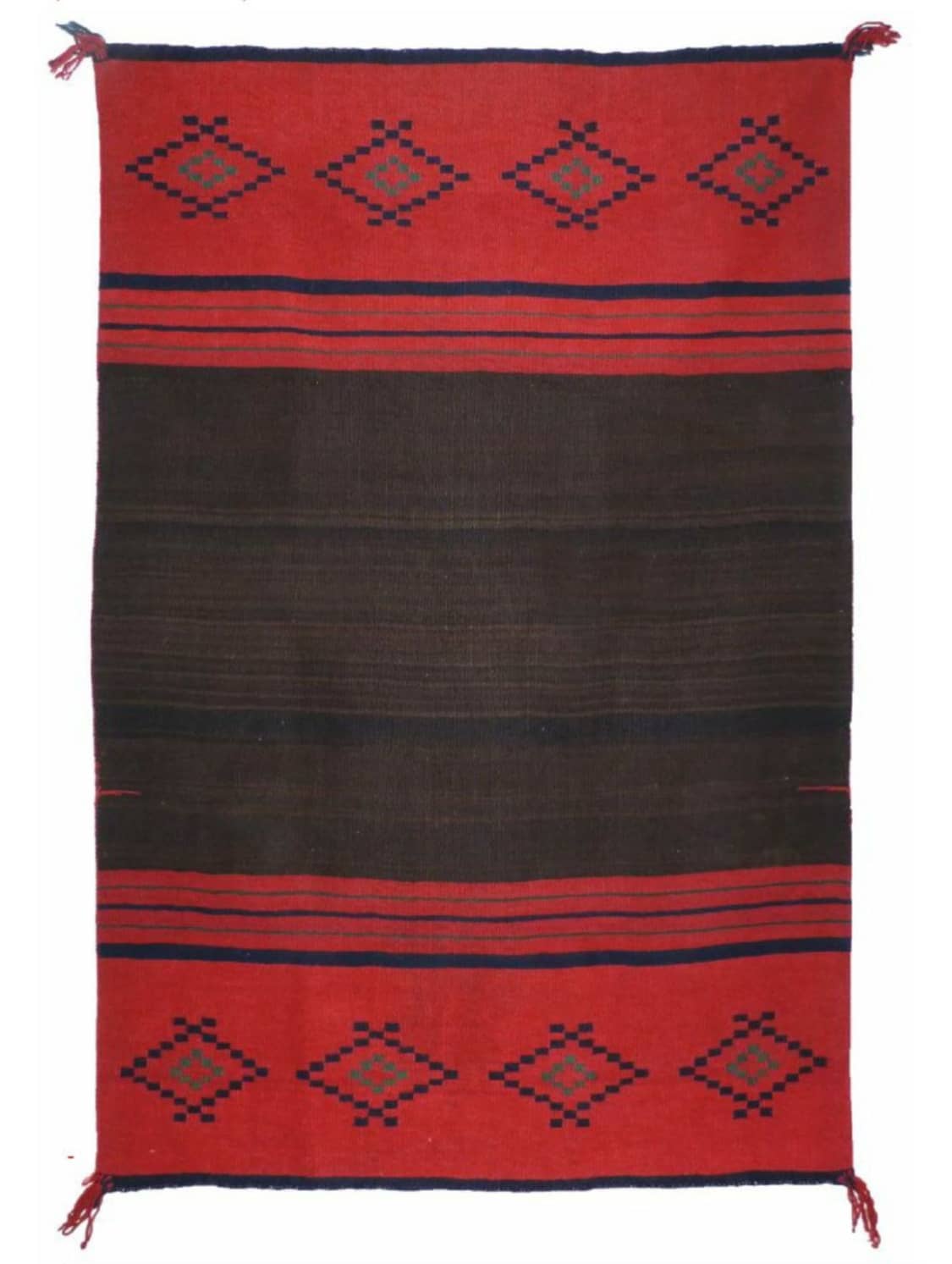 Two separately woven dress panels—mirror images of one another—are joined together at the sides, leaving room for the arms to come through, then held together with a woven sash. This is the traditional two-piece Navajo women’s dress, called biil. These expertly crafted textiles feature the classic designs of Navajo (Diné) basketry, characterized with colors of indigo blue and rich reds derived from cochineal or lac, and a dark brown center. The mirrored design of the two panels makes it so that when the garment is worn, the same design is displayed on either side. This style of Navajo dress signifies something special—they are one of the many threads in an illustrious tapestry of history, culture, and tradition for the Diné, meaning “The People” in the Navajo language.