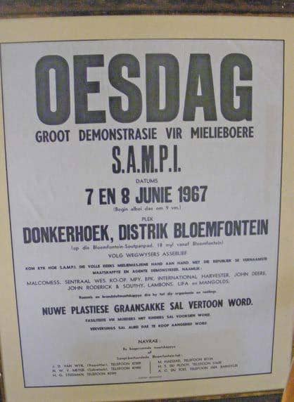 The very first Nampo Harvest Day, then called the Sampi Harvest Day, took place on 7 and 8 June 1967 on the farm Donkerhoek in the Bloemfontein district. Two hundred farmers attended the 1967 event. The current event is owned and hosted by Grain SA.