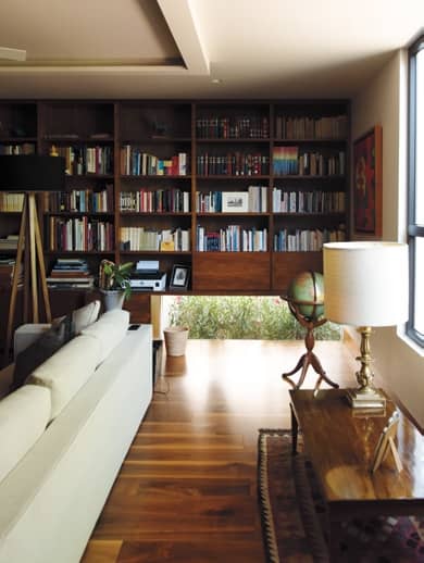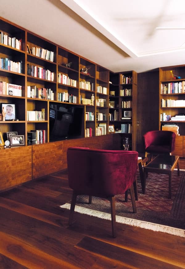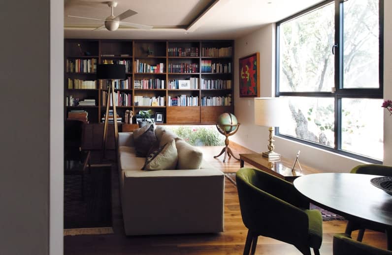 Un gran librero envuelve el espacio como elemento funcional y decorativo. Se utilizó una paleta de colores cálidos que crean una atmósfera seria y por medio de acentos de colores en el mobiliario se le entrega dinamismo a la habitación. En el gran ventanal se observa el patio de los mezquites y así se genera una atmósfera especial en el estudio de trabajo.