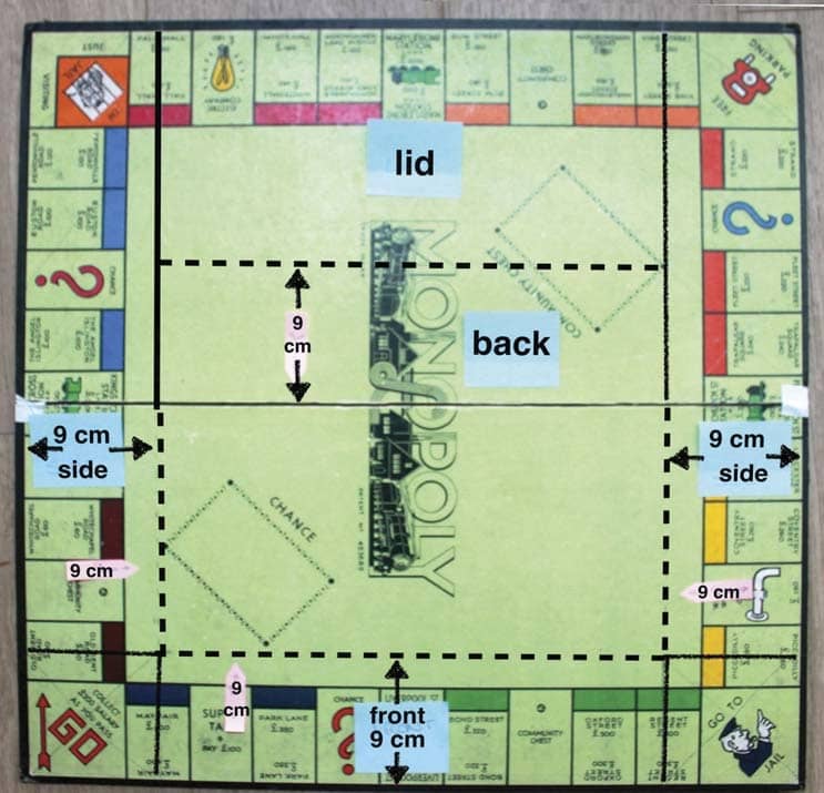 Now that our visiting grandchildren are getting into games, I needed to create something that would keep things in together. I had acquired my family’s old Monopoly board dating from the 1950s when my mother moved house last year and was certain something could be made from it. It has been well played with so is more than a little battered and all the pieces have vanished, but the board was still strong.