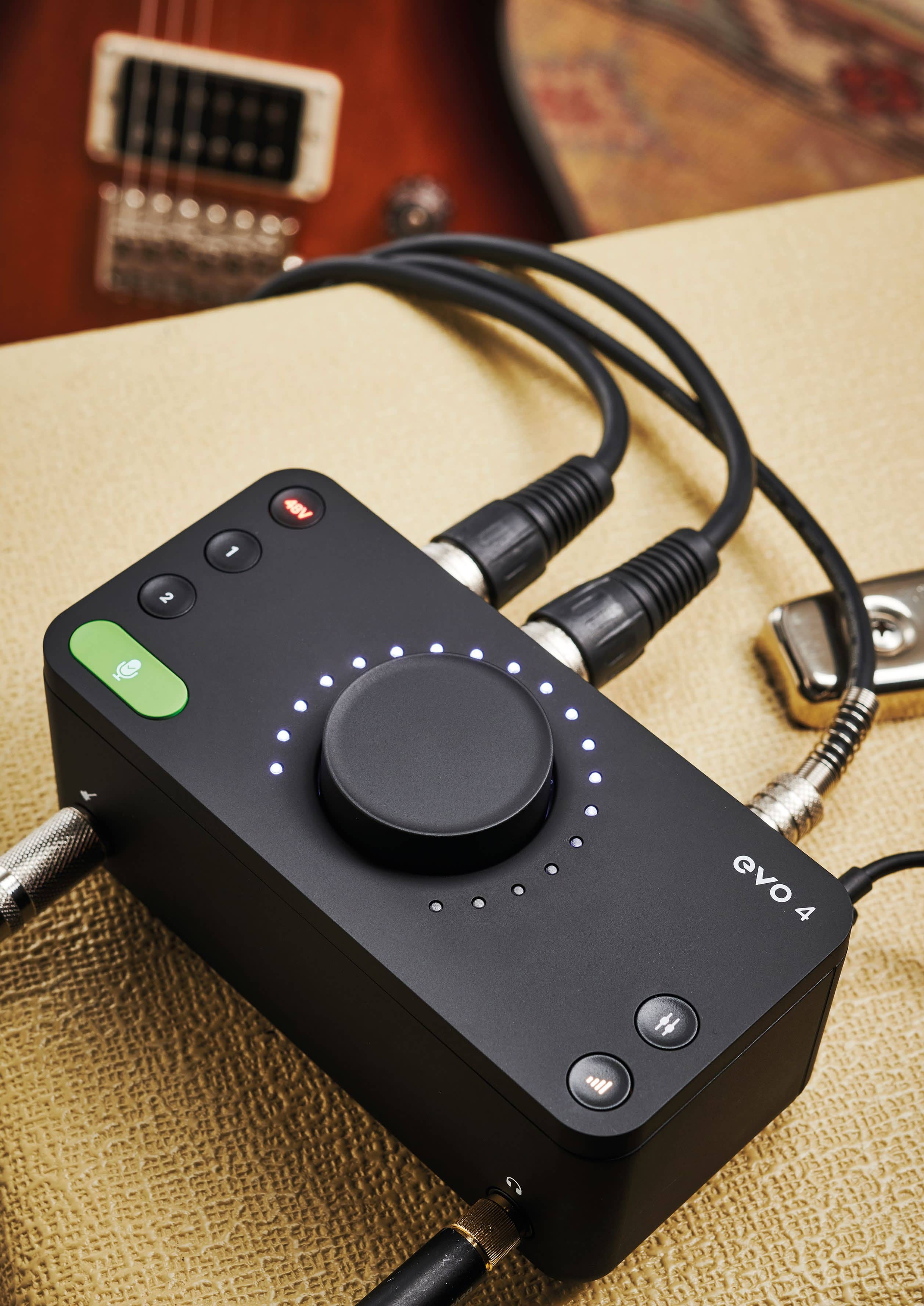 EVO 4 has a rather attractive cuboid design with a single instrument input and single headphone output on the front face (both ¼” jacks), and two combi (XLR/TRS) mic/line inputs and a pair of balanced outputs (¼” TRS jacks) on the back. The top face has a large encoder-style knob flanked by six backlit soft buttons and the bottom face includes a couple of desktop protector pads.