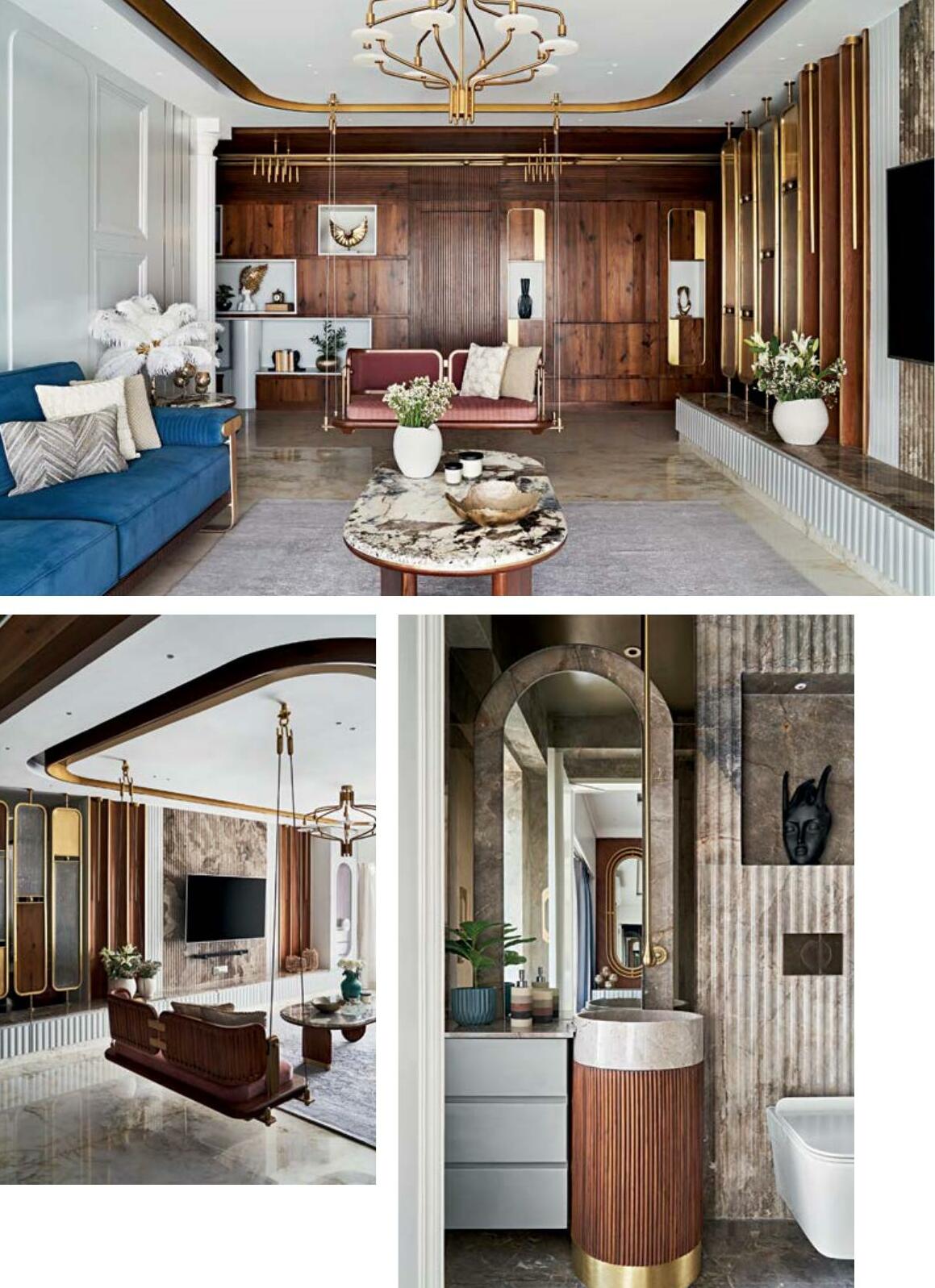Together, the thoughtful interventions break the dominancy and monotony of mouldings that run through the length of the walls. The furniture pieces that go perfectly well with the walls and the sublime flooring are finished in pastels and brass to effervesce a subtle yet striking matt gold touch. The outcome is a testament to the successful experimentation of design elements and materials, showcasing the potential and role of the Japandi-style in creating tranquil spaces.
