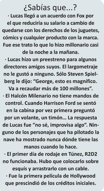Hace mucho tiempo, en una galaxia lejana, muy lejana... Episodio IV: Una nueva esperanza, título soso H y facilón donde los haya, se llamaba La guerra de las galaxias y parecía ser una película con principio y fin. Si bien su monumental éxito en taquilla garantizaba que habría continuaciones, no eran necesarias para entender y disfrutar las aventuras del joven Luke Skywalker. No se trata sólo de que aquella producción inicial haya crecido sin parar hasta convertirse en una de las marcas registradas más rentables de la historia del cine, con un valor que podría superar los 50,000 millones de dólares entre filmes, series y productos derivados, ni de que su expansión tras aquel bigbang no dé señales de parar: es que fue una cinta que, como 2001: odisea del espacio en su día, cambió la ciencia ficción para siempre, aunque de modo distinto: si la cinta de Kubrick reivindicaba la capacidad del género para entrar en temáticas adultas, la de George Lucas apostaba por la fantasía y la diversión.