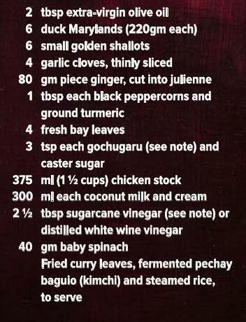 2 Reduce oven to medium-high heat. Add shallots, garlic, ginger, and peppercorns and cook, stirring frequently, until shallots start to colour (5 minutes). Add turmeric, bay, gochugaru, sugar, stock, coconut milk and cream and vinegar; bring to the boil. Add duck to pan, cover with lid and braise in oven until meat is very tender (2 hours).